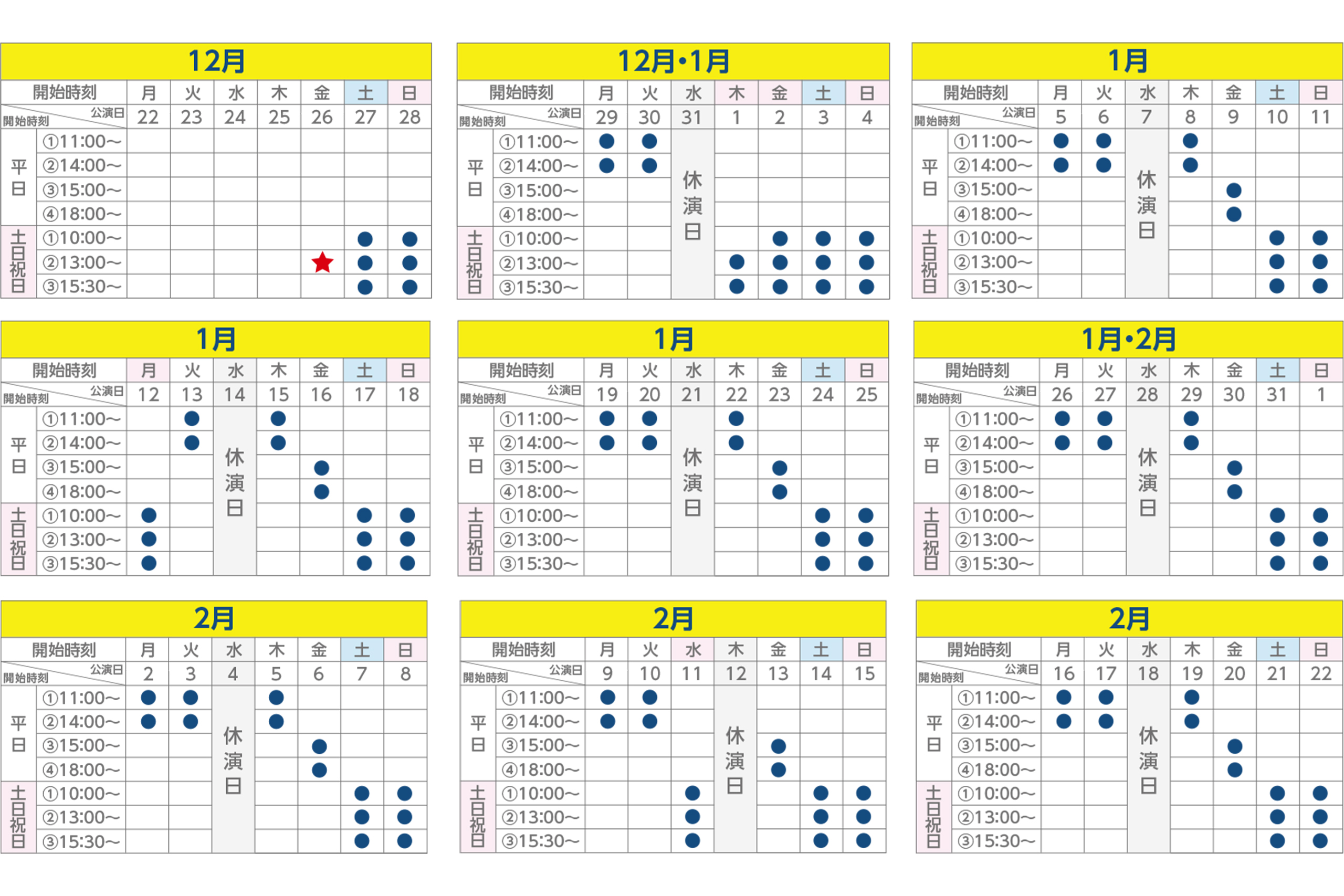 - 1次公演时间约1小时30分钟(内休息10分钟)。