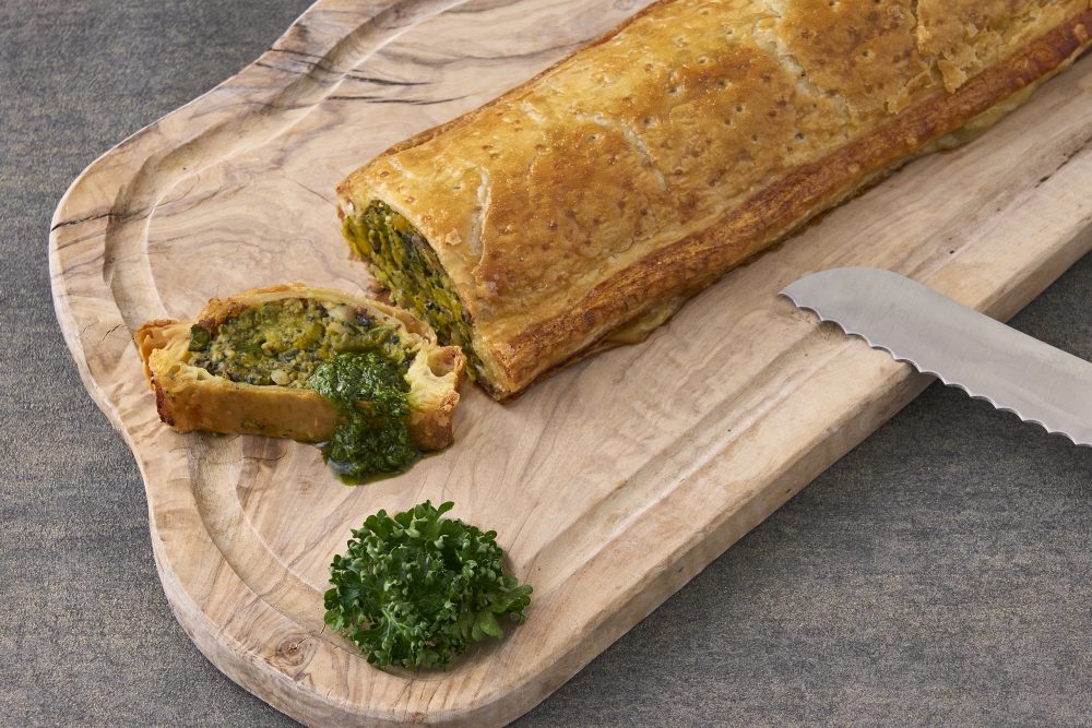 通常使用される牛肉の代わりに、ローストした野菜ときのこをサクサクのパイで包み、季節のソースで仕上げました。野菜の甘みときのこの旨みが感じられる、満足感のあるベジタブルメニューです。