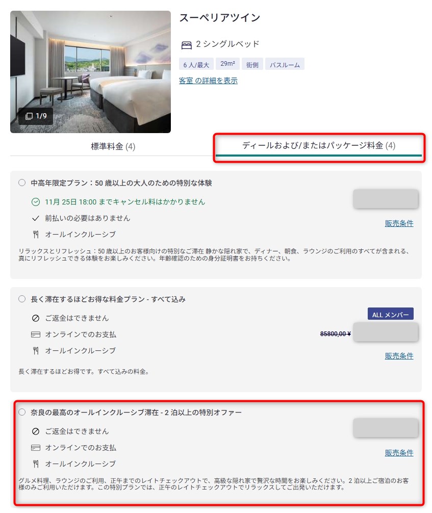宿泊日と人数を検索し、お部屋を選んだのち、「ディールおよび/またはパッケージ料金」を選び、「奈良の最高のオールインクルーシブ滞在 - 2 泊以上の特別オファー」の記載があるプランをお選びください。