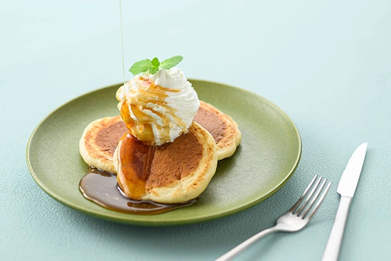 外はほんのり香ばしく、中はしっとりふわふわ。ひとくち頬ばれば、優しい甘さが口いっぱいに広がる至福のパンケーキ。クリームとともに、お好みのスタイルでお楽しみいただけます。