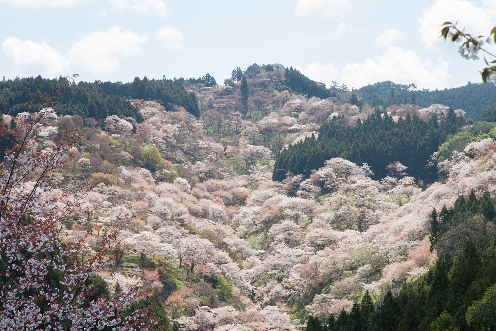 吉野山作為賞櫻勝地而聞名。春天大約有3萬株櫻花填滿了山體。以柔和色調的白山櫻為中心盛開,可以欣賞到深深地沁入心的風景。櫻花密集在下千本、中千本、上千本、奧千本4個地方,從山腳下千本開始按標高順序開放,花期持續很長時間。